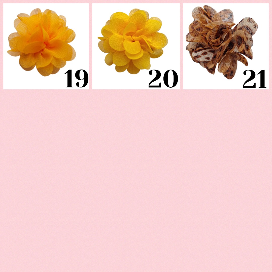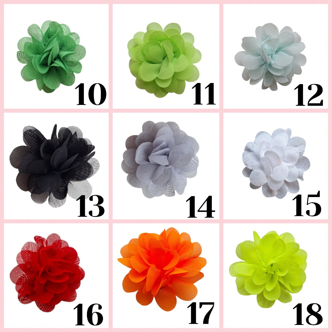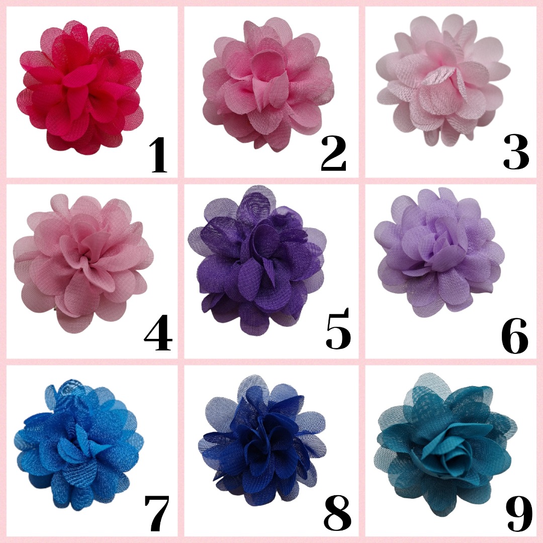 Leuke haarclips met chiffon bloemen. Deze bloemen zijn bevestigd op een alligator clip. Verkrijgbaar in veel verschillende kleuren. De bloem is ongeveer 5cm groot. Leuk als toevoeging bij een staart of knot. Maar ook leuk als lok clipje te dragen.